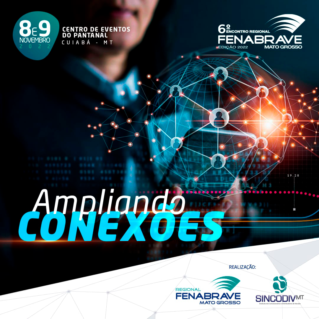 A FENABRAVE Regional Mato Grosso e o Sincodiv/MT realizam o 6º Encontro que traz o tema “Conecte-se ao Setor Automotivo”. O Evento acontece nos dias 08 e 09 de novembro de 2022, no Centro de Eventos do Pantanal, em Cuiabá-MT. A abertura do evento, tem em sua programação palestras e feira de produtos e serviços. Como previsão de iniciar às 18:00h do dia 08 de novembro e segue durante o dia 09 de novembro. Confira a programação no site encontro.fenabravemt.com.br. Para confirmação de presenças e outras informações, fale pelo telefone (65) 99314-6838 ou ainda pelo e-mail sincodivmt@gmail.com.
