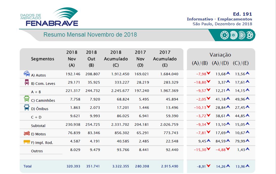 De acordo com o levantamento realizado nesta segunda-feira, 3 de dezembro, pela FENABRAVE – Federação Nacional da Distribuição de Veículos Automotores, entidade que representa mais de 7.400 Concessionários de veículos, o segmento de automóveis e comerciais leves somou, no acumulado de janeiro a novembro, 2.245.677 unidades licenciadas, resultado que representa alta de 14,15% sobre as 1.967.369 unidades de igual período de 2017. Em novembro, foram vendidas 221.317 unidades deste segmento, apontando crescimento de 12,21%, sobre o mesmo mês do ano passado. Na comparação com outubro, quando foram licenciadas 244.732 unidades, as vendas de automóveis e comerciais leves, em novembro, mostram retração, de 9,57%. O mercado total, considerando automóveis, comerciais leves, caminhões, ônibus, motocicletas, implementos rodoviários e outros, somou, no acumulado do ano, alta de 13,96%, registrando 3.322.355 unidades, contra as 2.915.490 unidades vendidas em 2017. Apenas em novembro, as 320.393 unidades emplacadas no País representaram 14,26% de alta sobre o…